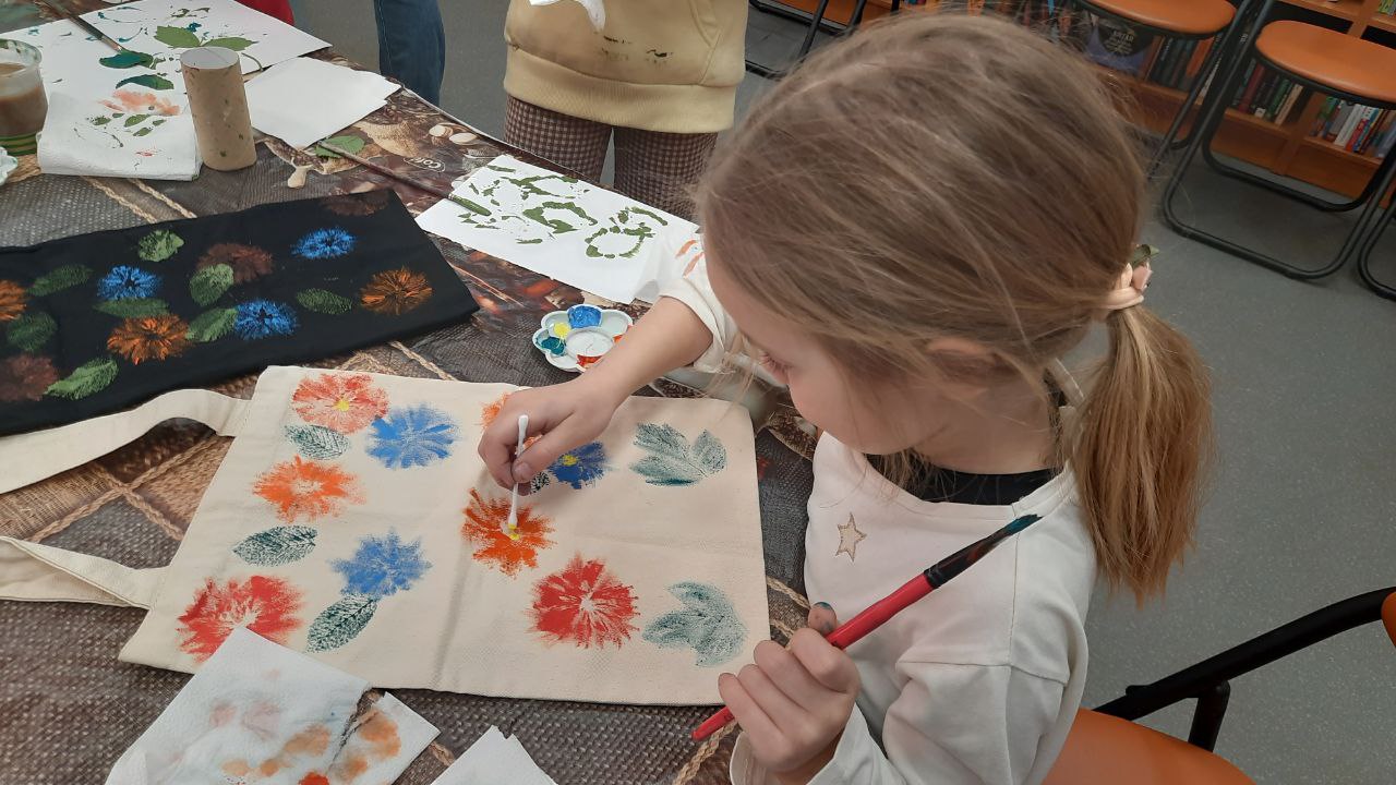 А в 13:00 Ирина Труханова, которая ранее участвовала в библиотечном проекте «Креативная среда» и проводила мастер-класс по созданию ботанических принтов, помогла каждому участнику нарисовать неповторимый узор на холщовом шопере.