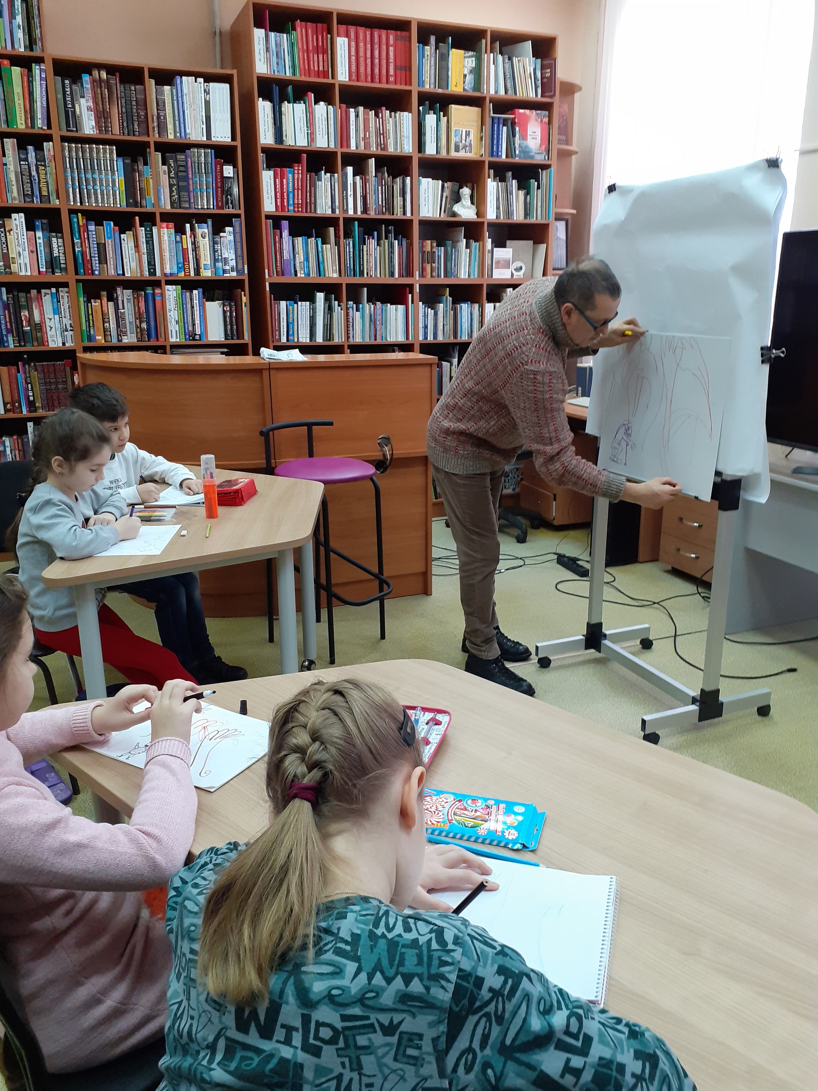 Учащиеся ЦО № 32 вместе с художником сочиняли сказку и пытались её нарисовать. Здесь был и темный лес, который все срисовывали с собственных загнутых пальцев, и старый дед, волшебным образом превращающийся в молодого принца, и живое солнце, и много чего еще. Михаил Левшин показал, как из кругов и овалов нарисовать волка, как дать понять, что он уже старый и добрый, как дополнить картину ярким пятном и сделать из него, например, девочку.