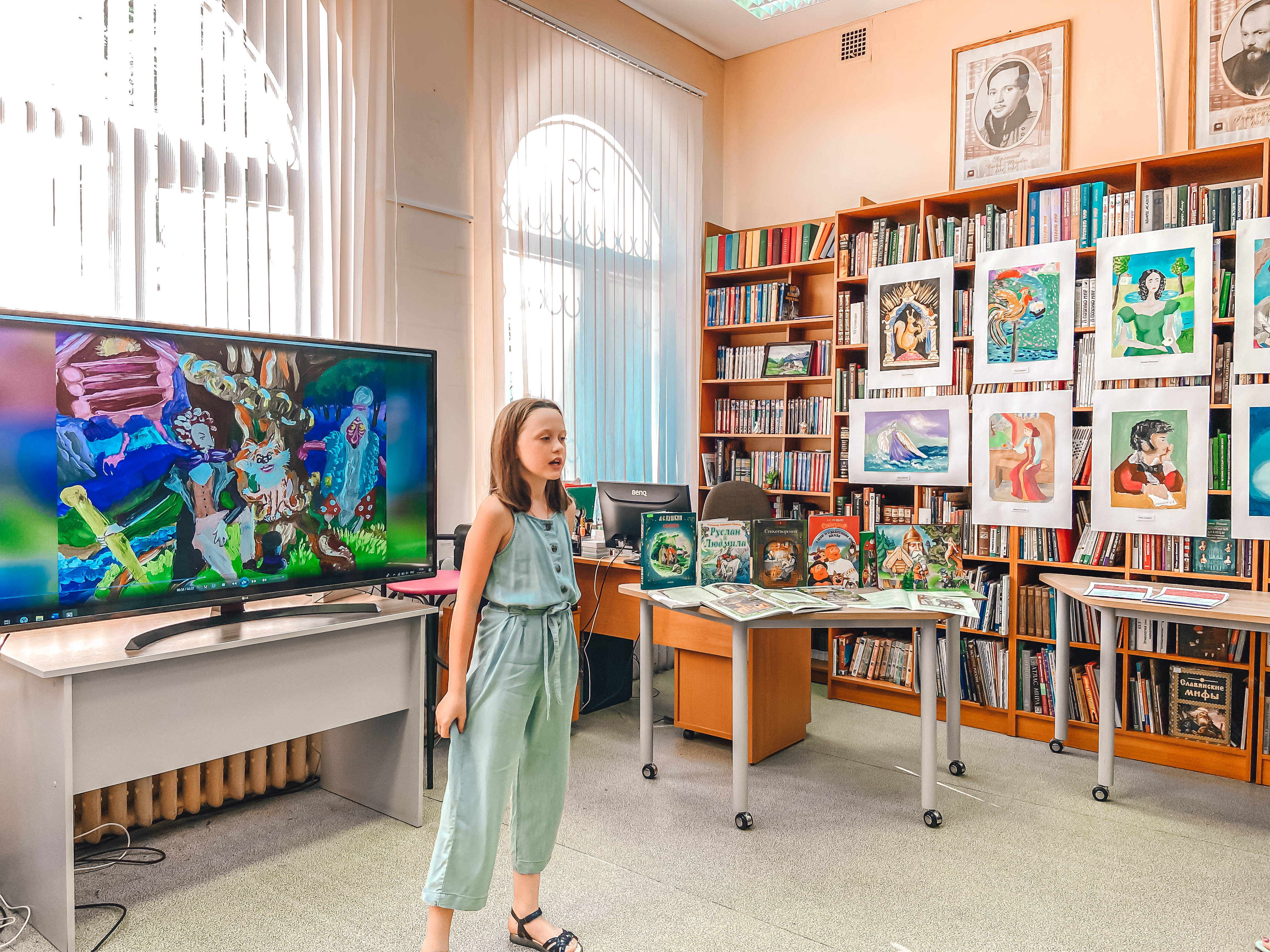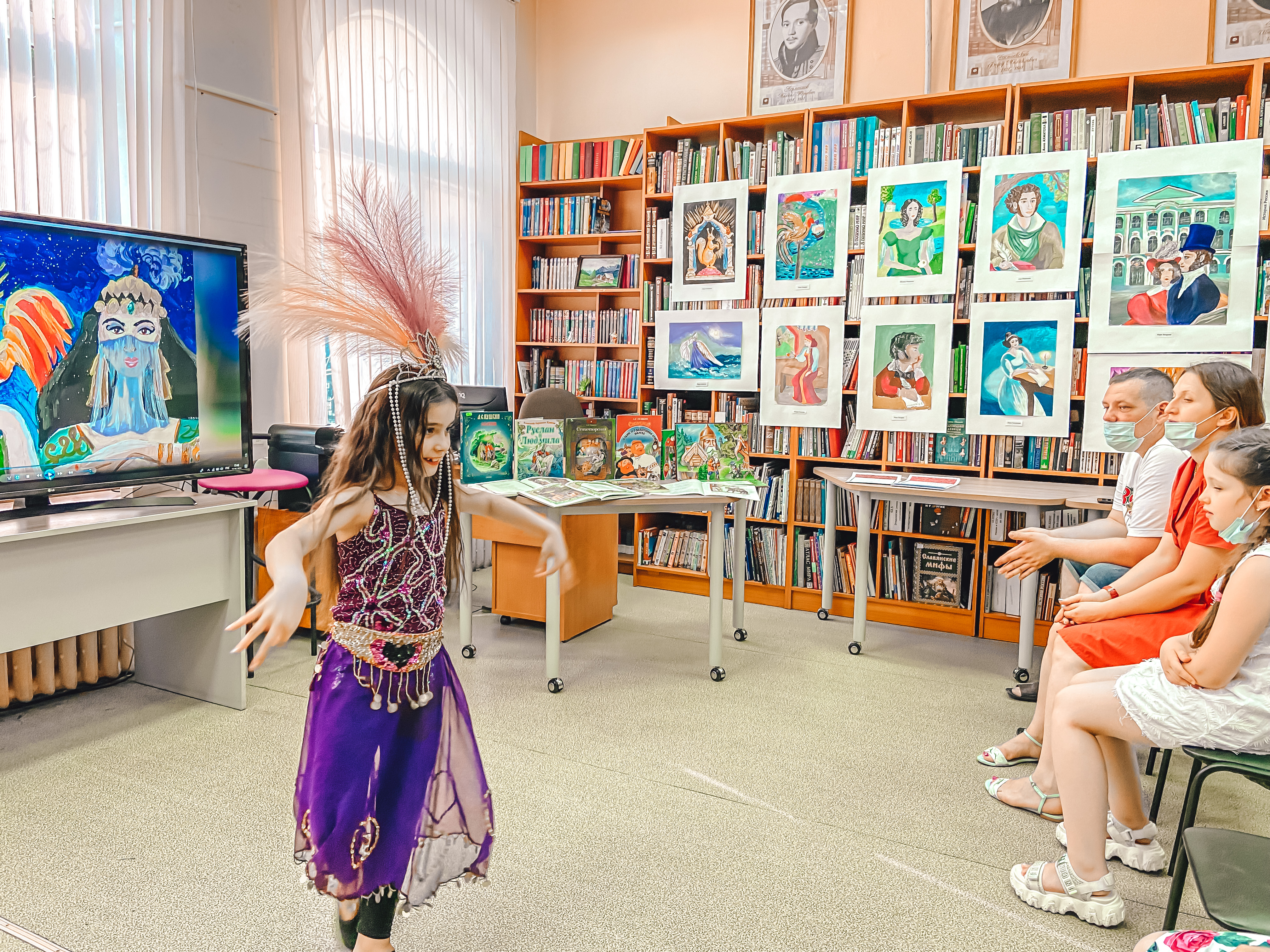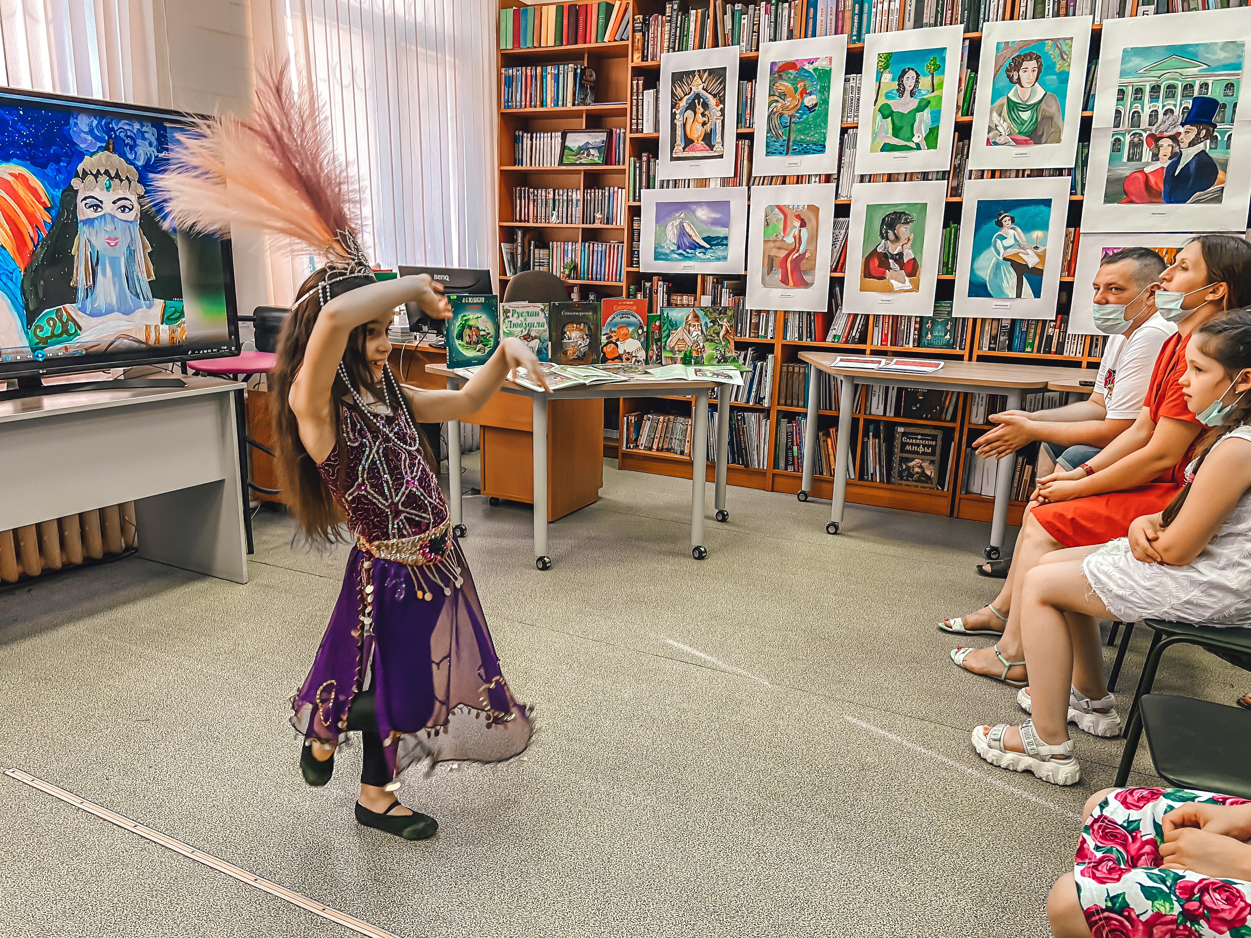 На открытии выставки юные художники представили небольшую концертную программу с чтением стихотворений и художественно-танцевальными композициями. А преподаватель студии Элина Торос рассказала об истории портретов Пушкина, а мы подготовили выставку книг Пушкина с иллюстрациями в разных стилях и провели экскурсию по библиотеке.
