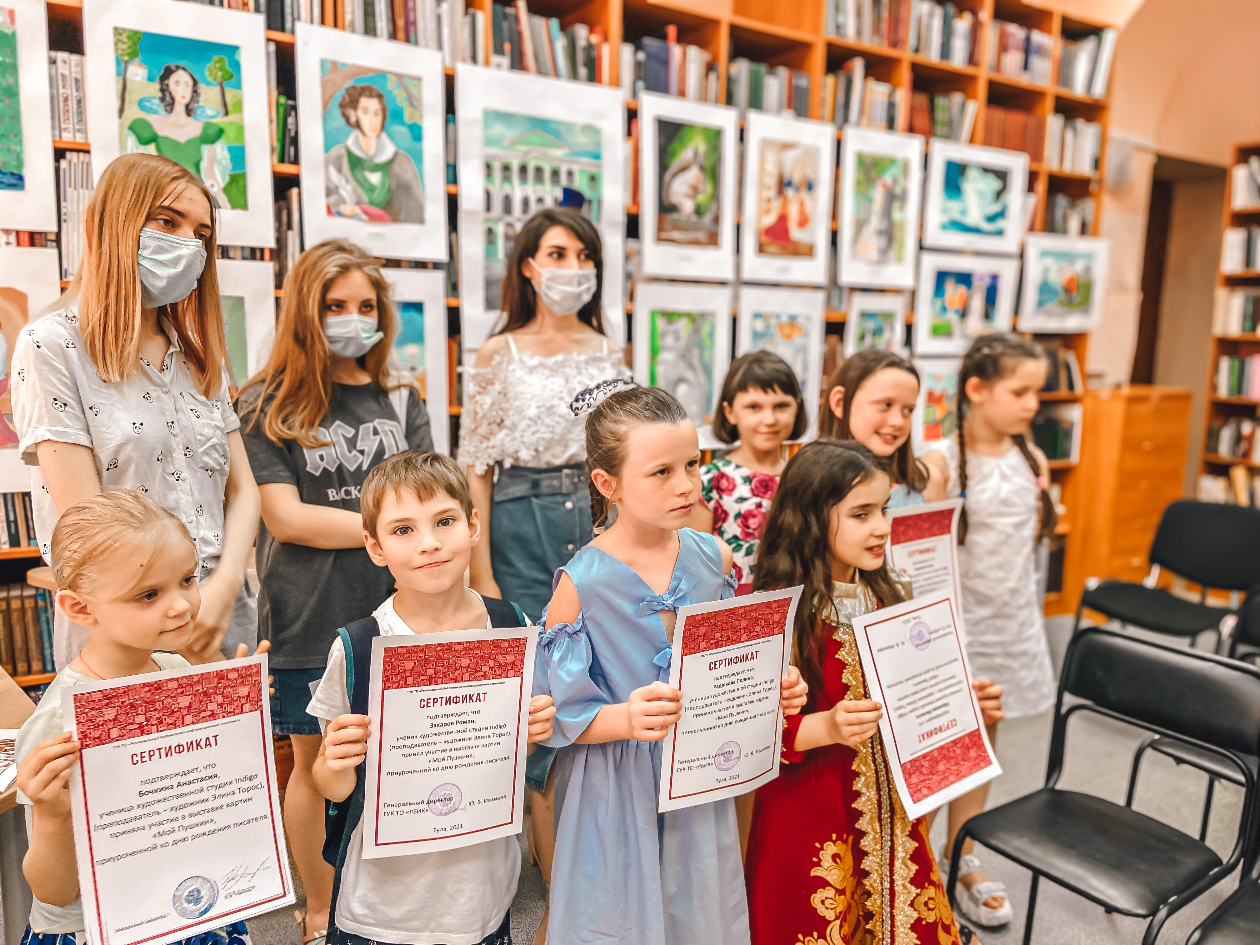 Весь июнь дети художественной студии Indigo рисовали картины, вдохновлённые образом поэта и его творчеством. На выставке вы можете увидеть портреты Пушкина и его жены, иллюстрации к сказкам и «Евгению Онегину».