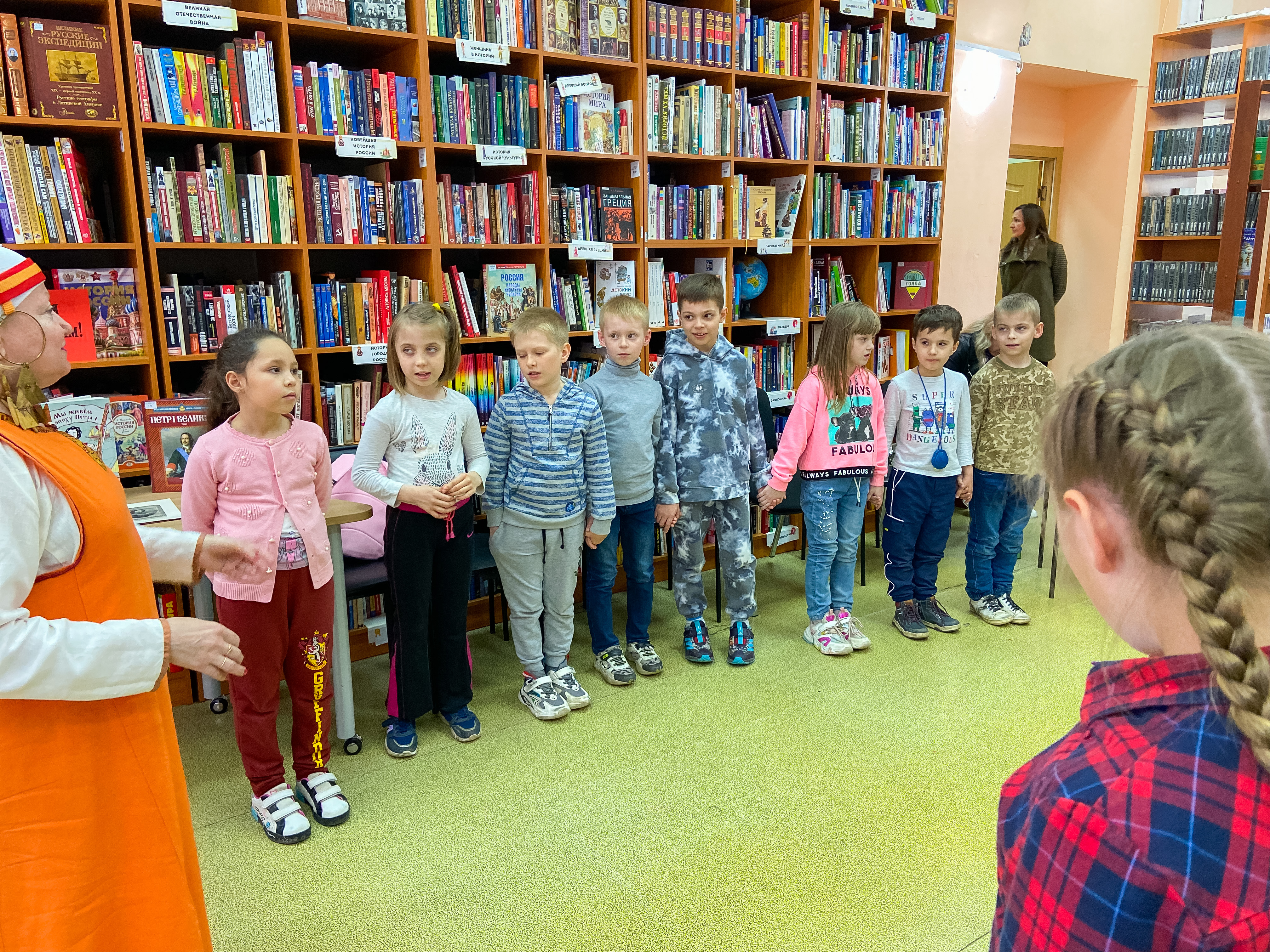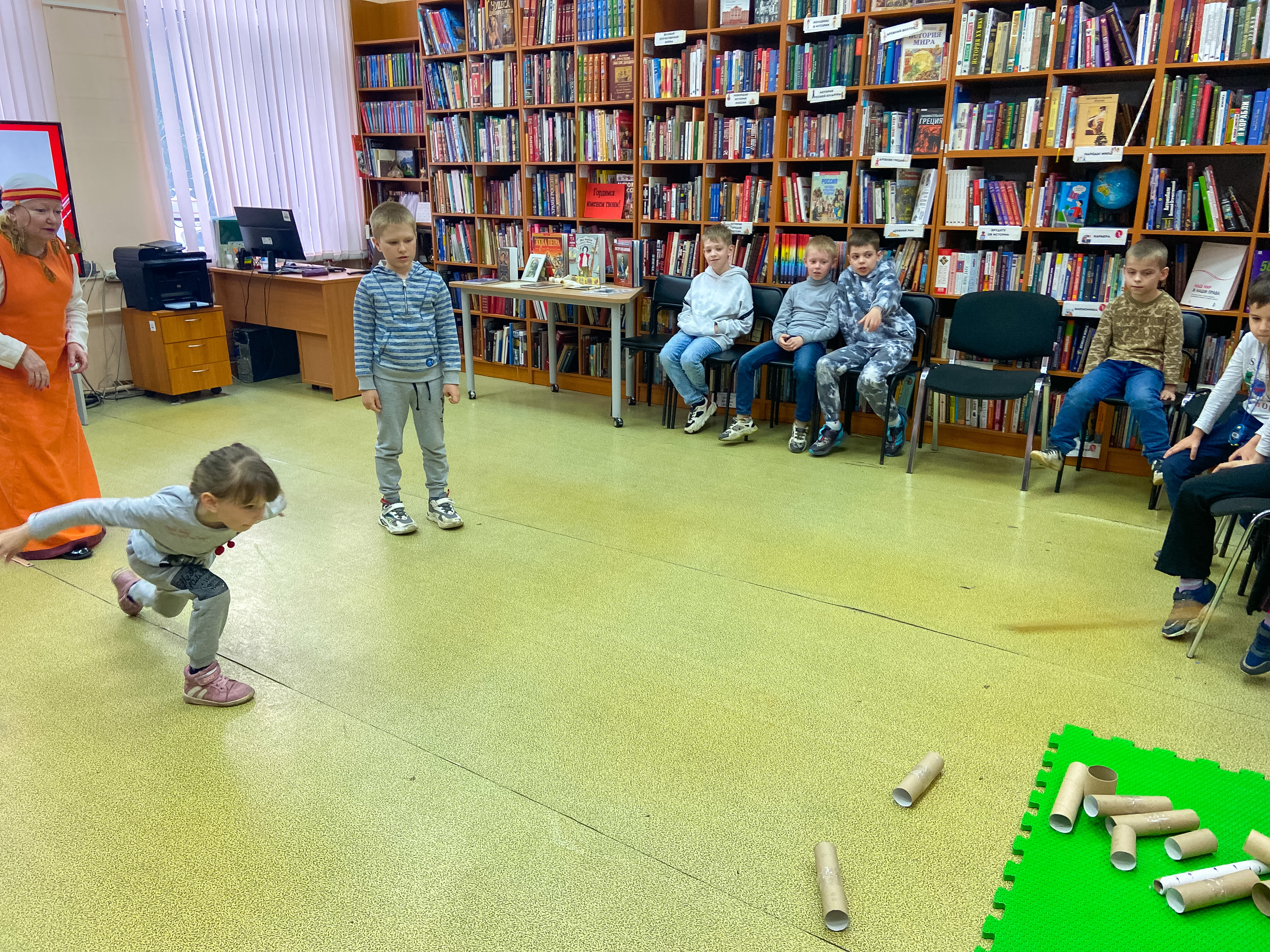 Затем снова переместились во времени – в Петровскую эпоху. Ведущий библиотекарь Надежда Моторина научила всех желающих играм той поры: бояре, ручеёк, бирюльки, городки, калечина-малечина – попробовали всё!