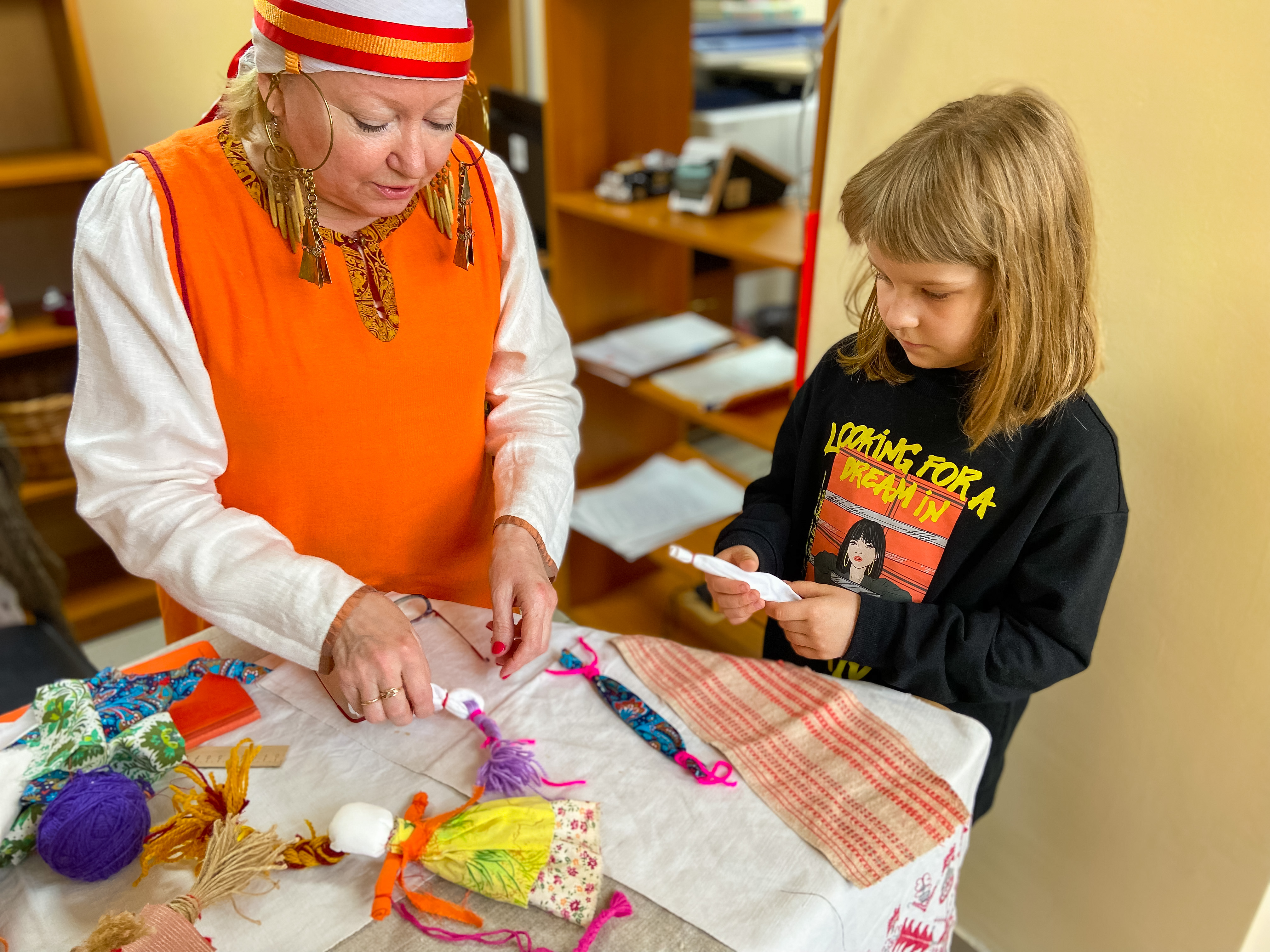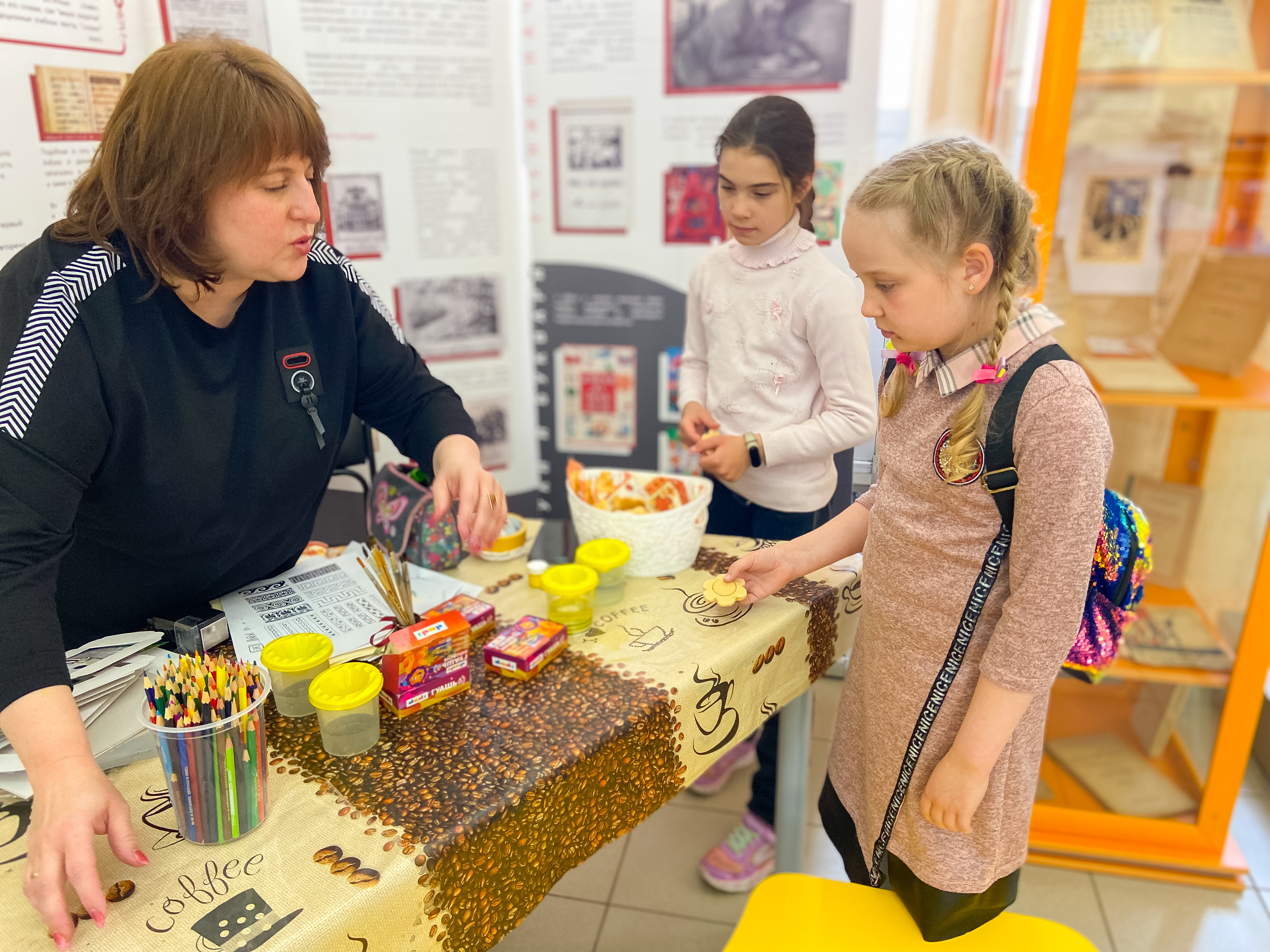 Также всю вторую половину дня в фойе работали интерактивные зоны: делали игрушки-мотанки, создавали формы для печатных пряников, моделировали узоры для вышивки на основе традиционных орнаментов и знакомились с народным костюмом Тульской губернии по книге-раскраске Юлии Бортулевой и Полины Ильяш.